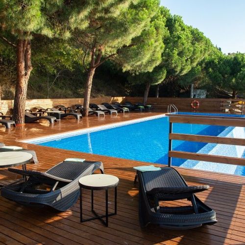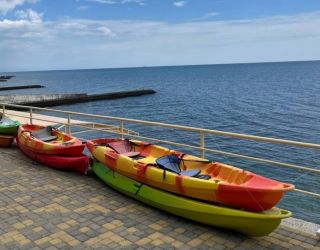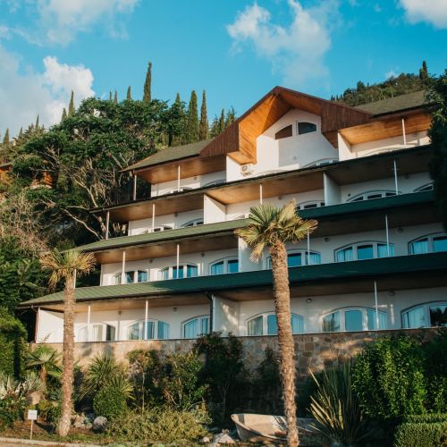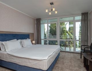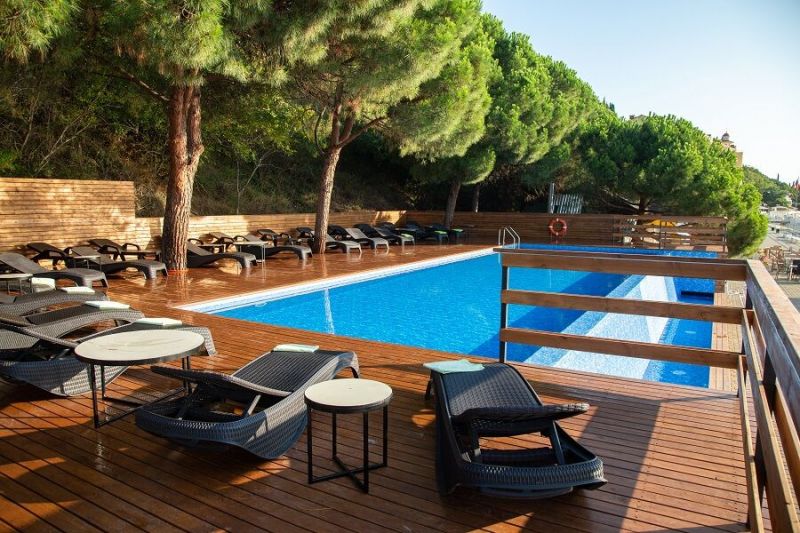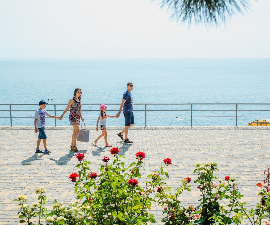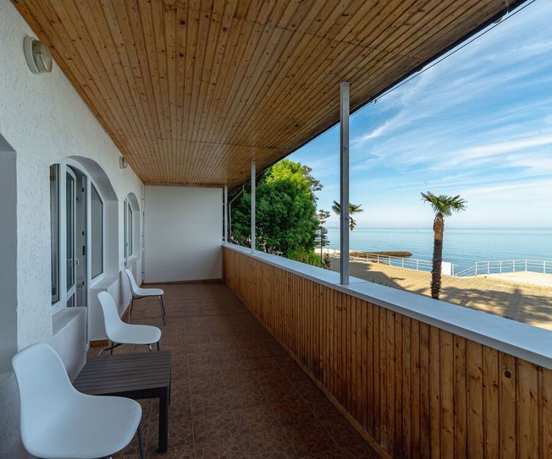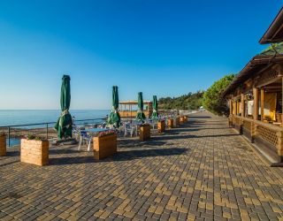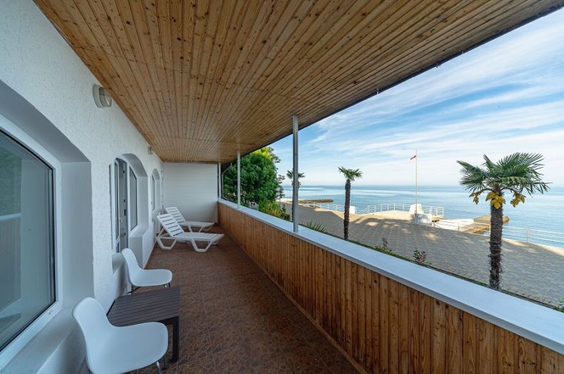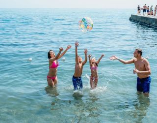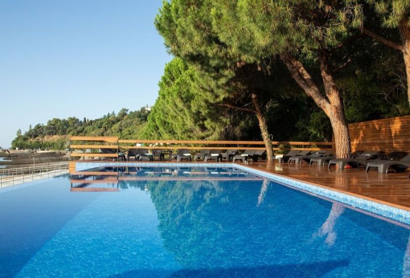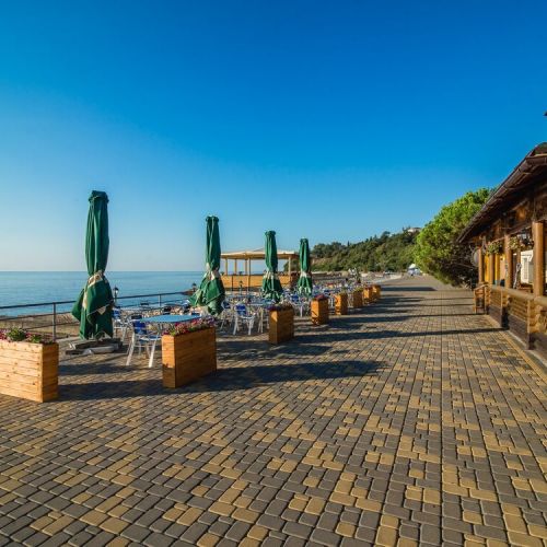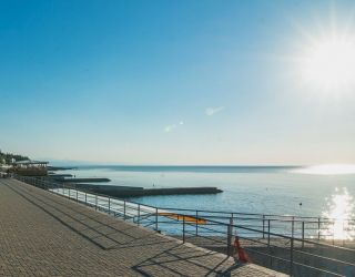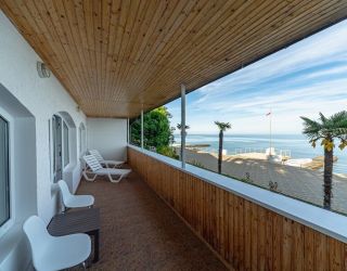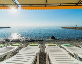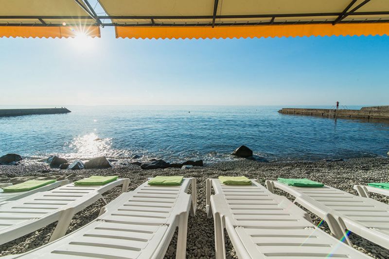 У пансионата 4 собственных больших оборудованных пляжа. На мелко-галечном побережье есть все, что нужно для отдыха у воды – кафе, шезлонги, зонтики от солнца, раздевалки.