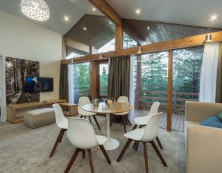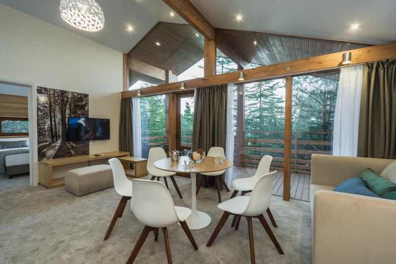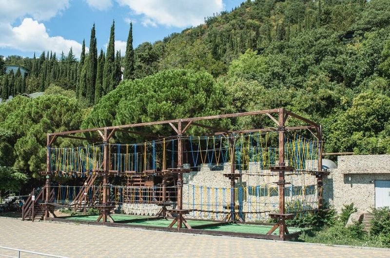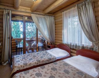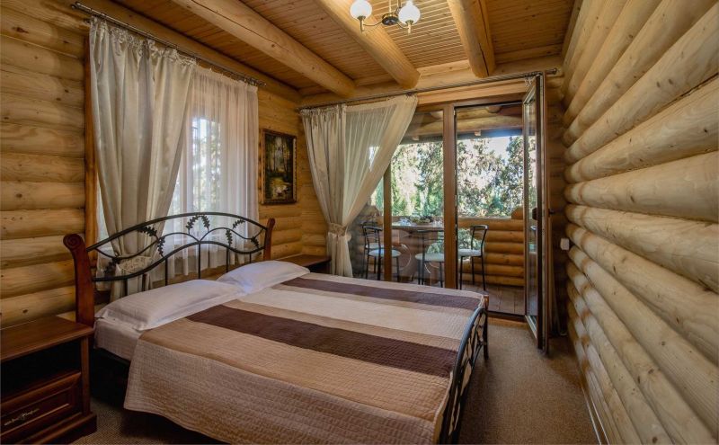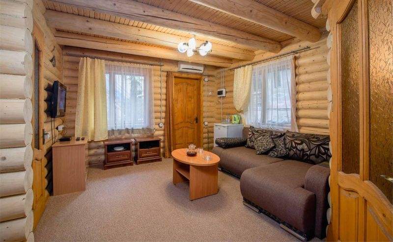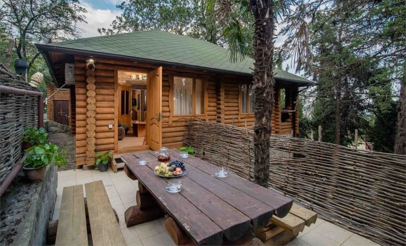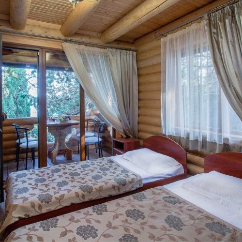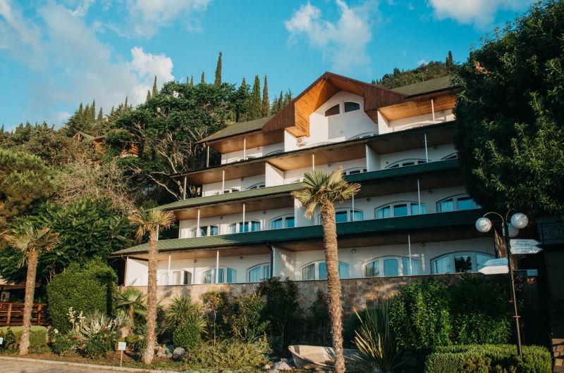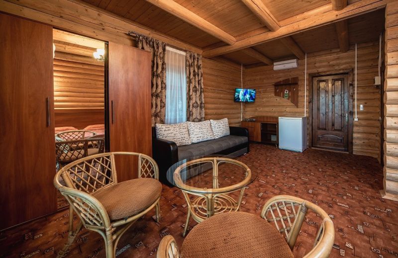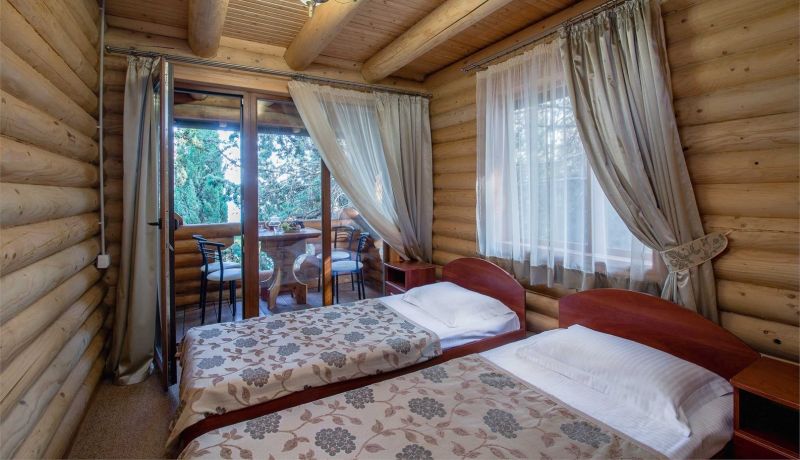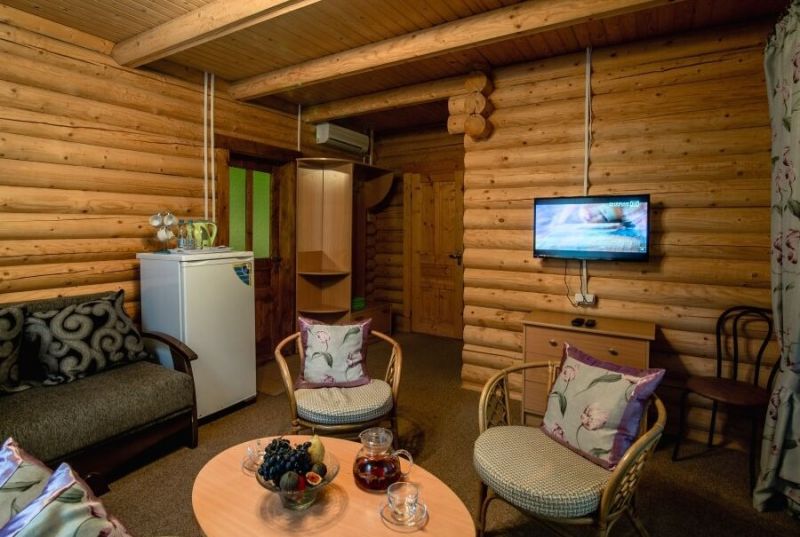 Комплекс, расположенный на парковой территории на первой береговой линии, включает в себя два гостевых корпуса и 24 деревянных коттеджа, выстроенных из карпатской сосны. Во всех номерах предусмотрен санузел с душем, есть кондиционер, спасающий от крымской жары, телевизор, электрочайник, фен. В ряде комнат имеются балконы с видом на море. В коттеджах помимо спальни есть гостиная и кухня, оснащенная необходимой посудой и техникой, меблированная терраса, а в некоторых домах установлены панорамные окна.